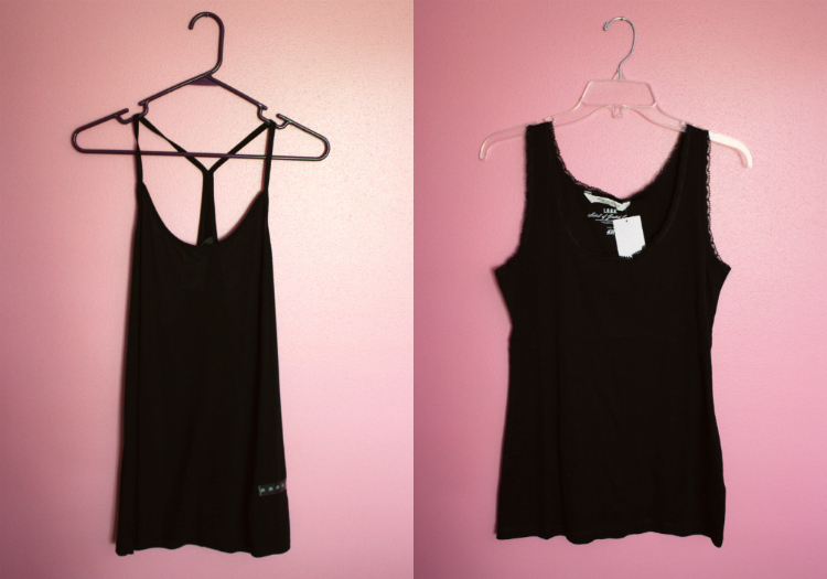 Looser, longer black racerback tank - $12.95, basic lace cami - $7.95